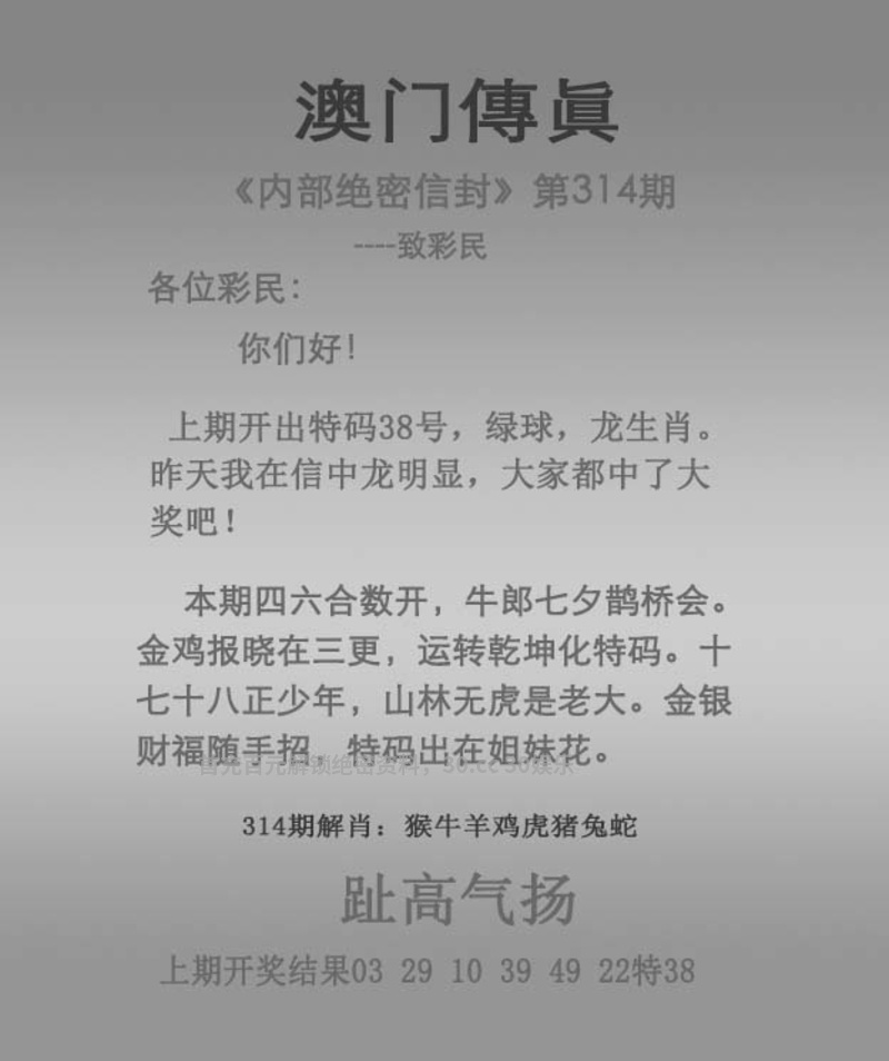| 314期:挂牌《裁书叙心》 解释:意为通过书写信件来表述心意。 解料:通过书写信件。解书肖龙马虎,挂:04爆:羊。 七肖:虎羊马龙狗鸡猪 特码:04.16.23.47.12.24.02.38.08.44.09.45.07.43 |
